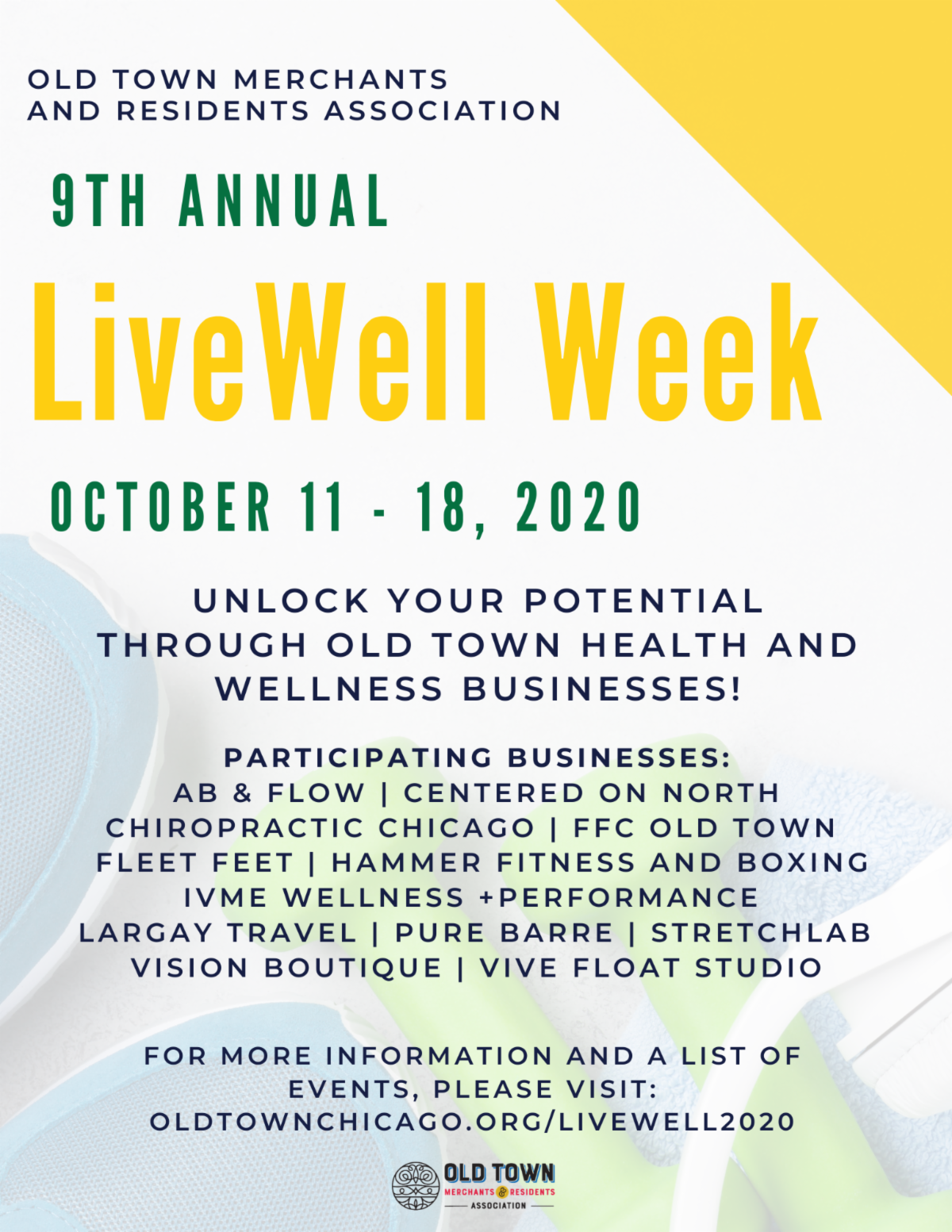 The Old Town Merchants and Residents Association (OTMRA) will be hosting the 9th annual LiveWell Week, October 11-18. This year the OTMRA is adapting LiveWell Week programming to fit the needs of a COVID world. In addition to in-person programming, we will be offering virtual content from health and wellness studios. There will also be a socially-distanced outdoor Crunch & Brunch at the Chicago History Museum!