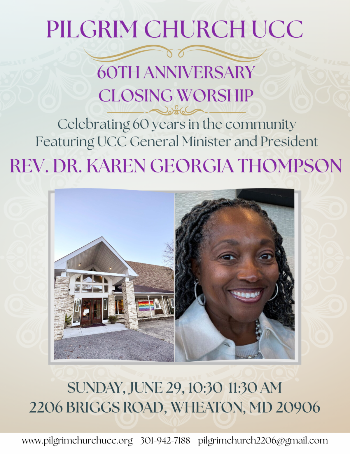 Join Pilgrim Church in celebrating our 60th Anniversary Closing Worship featuring UCC General Minister and President Rev. Dr. Karen Georgia Thompson. Sunday, June 29th, 10:30 a.m., 2206 Briggs Road, Wheaton, MD 20906. All are welcome! (No RSVP necessary).
