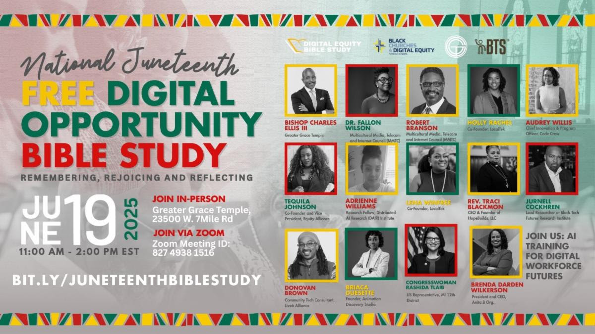 The 2025 National Juneteenth Digital Opportunity Bible Study features an impressive lineup of speakers and invited guests, each with insights and expertise to help foster discussions on equipping Black communities with workforce development skills for an AI-driven job market. Rev. Traci Blackmon, a national faith leader, pastor, teacher, preacher, and public theologian, will deliver an inspiring keynote address. This gathering will bring together key influencers from various sectors, including faith, technology, and education, all committed to advancing digital opportunity.