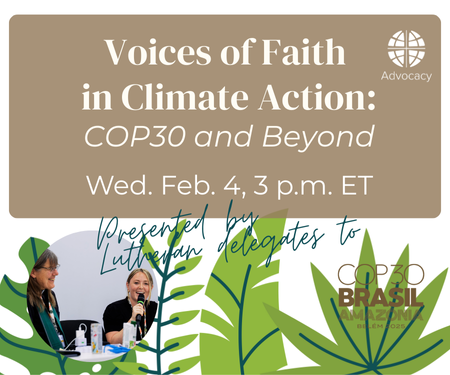 Hear from Lutherans who attended the UN COP30 as they give updates, reflections and direction on meaningful action toward climate solutions. Panelists will gather on Feb. 4 at 3 p.m. ET. “Why do Lutherans bother to show up to COP year after year?” asked delegate Laura Muther. “Our presence at COP means that we can carry these stories of faithful people with us.” Hear for yourself and join us in the commitment to climate care!