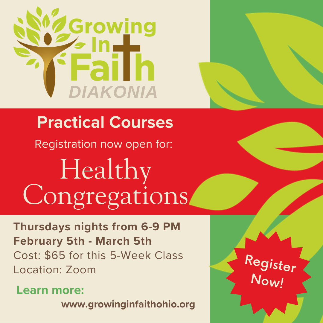 Registration is now open next Growing In Faith: Diakonia courses! Two virtual courses will run simultaneously every Thursday from 6:00-9:00 PM during the five weeks of February 5th to March 5th! For Course 4, the Foundations Course is Intro to New Testament and the Practical Course is Healthy Congregations.