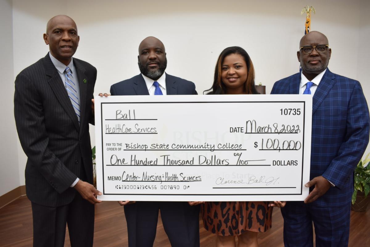 Pictured (l to r): Dr. Lawrence Brandyburg, Interim President at Bishop State; Kevin Ball, Director of Operations at Ball HealthCare Services; Cherise Ball Wilson, Director of Operations at Ball HealthCare Services; Clarence M. Ball, Jr., President and Chief Executive Officer of Ball HealthCare Services