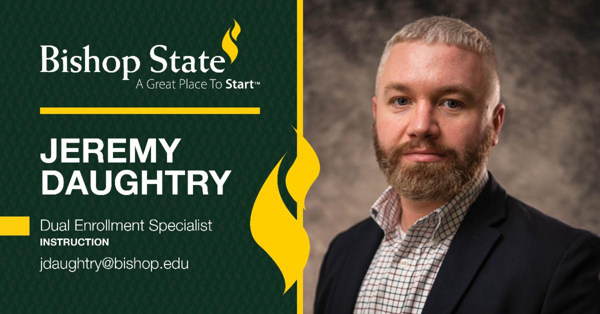 Dr. Jeremy Daughtry is the new Dual Enrollment Instructional Specialist in the Instructional Department. He is a native of Lucedale, Mississippi but has lived in Mobile since 2005. He was last employed at Mississippi Gulf Coast Community College. Dr. Daughtry earned a Bachelor of Arts in English and Psychology, a Master of Arts in English, and a Doctorate in Educational Leadership from the University of South Alabama. His professional accomplishments include Phi Theta Kappa (PTK) Distinguished College Administrator for 2021 and is a graduate of the Mississippi Community College Leadership Academy (MCCLA) 2019-2020. His hobbies include working out, home improvements, and spending time with family and friends.