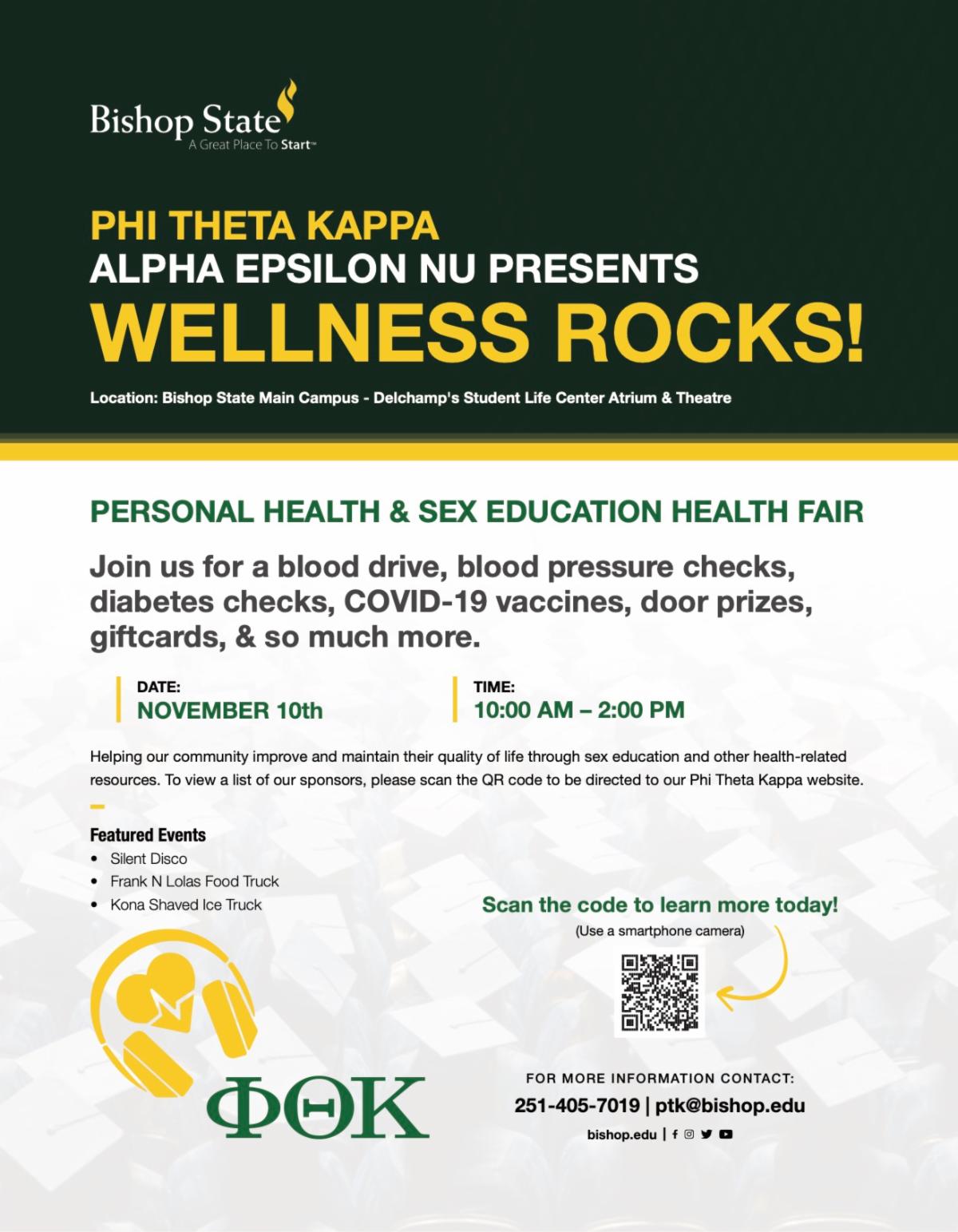 Bishop State's Phi Theta Kappa students are helping other students and the community improve and maintain their quality of life through sex education and other health-related resources. There will be a blood drive, blood pressure & diabetes checks, COVID-19 vaccines, a SILENT DISCO, a helicopter landing on campus with tours, food trucks, door prizes, gift cards, & so much more!!
