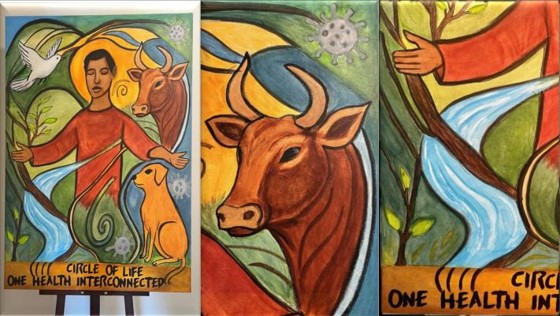 Art can make complex science accessible without sacrificing accuracy. This artwork was created by Esther O. Onuselogu as an educational piece to promote One Health and to help raise awareness about One Health through Art communication. At the center of the piece stands a human figure, arms outstretched, encircled by flowing lines that link a bird, a cow, a dog, rivers, trees, and symbolic microbes. The Dove represents freedom and fragility, reminding us that environmental change affects even the most delicate aspects of nature. The Cow and Dog reflect the domestic animals closest to us, sources of food, companionship, and livelihood. The Swirling Rivers and Trees symbolize life-giving ecosystems that sustain both humans and wildlife. The Circular Microbes represent the invisible threats that can ripple across species. The One Health Professionals (implied through connected lines and care in the scene) symbolize the collaboration needed across disciplines to maintain planetary health. Circle of Life serves as an educational tool, a conversation starter, and a visual call to action, demonstrating the power of art–science collaboration to engage audiences, amplify public health messages, and inspire collective awareness.” https://tinyurl.com/4vhz8c67
