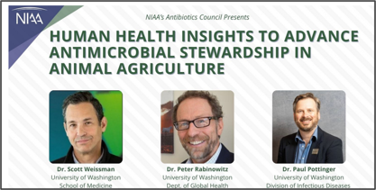 Hosted by the National Institute for Animal Agriculture. The history of human health stewardship was discussed and with transition into animal agriculture stewardship. Speaker Dr. Weissman's presentation was followed by a panel discussion with Dr. Peter Rabinowitz, Dr. Paul Pottinger, and moderated by Dr. Heather Fowler. Attendees received practical insights from public health including opportunities for cross-sector collaboration. This session fostered dialogue between sectors and highlighted how One Health-informed strategies can accelerate progress in responsible antimicrobial use and resistance mitigation in animal agriculture. https://tinyurl.com/yc2krymh