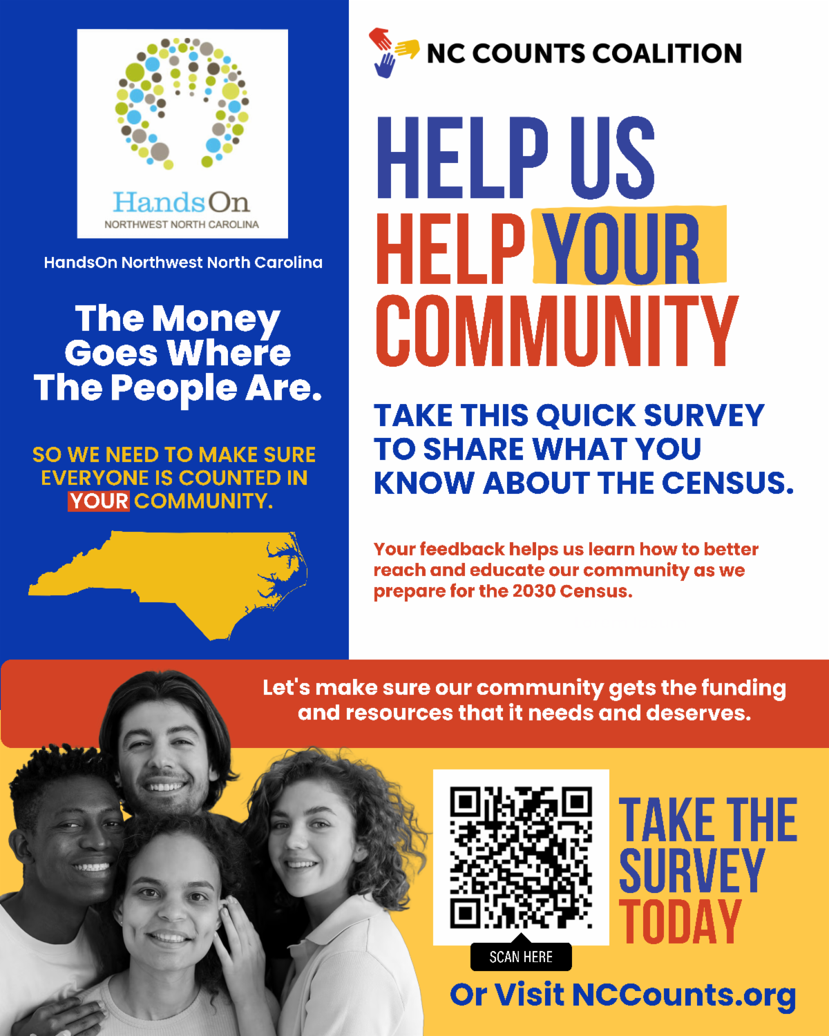 The NC Counts Coalition and HandsOn Northwest North Carolina invites you to take a quick survey to help ensure everyone in our community is counted.