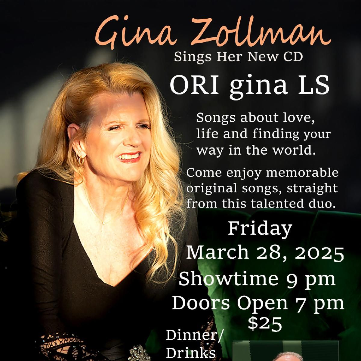 Gina Zollman to perform her hit show ORIginaLS at The Gardenia on Friday, March 28. Come enjoy memorable original songs, straight from this amazingly talented singer. Special guest co-writer/songwriter Kevin Fisher (Sara Evans, Rascal Flatts, Little Big Town, Home Free, Uncle Kracker and more) will be joining the show with songs about love, like and finding your way in the world.