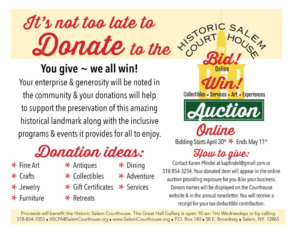 Thank you to all those that donated last year! AA & J Enterprises, Al and Sara Jane Cormier, Al Wilson, Alan Hutchinson, Ashley McCuin, Authentic Designs, Battenkill Books, Battenkill Valley Creamery, Big Big on the Battenkill, Blind Buck Valley Farmstead, Bob Skinner, Booth’s Blend Compost, Christa Kanellis of Pawsitively Dapper, Christine Levy, Christine Michael, Country Gals Cafe, Darren Johnson, Donna Orlyk, Dottie Schneider, E. L. Designs, Elsasser’s Beim @111, Faerydale Consignment & Gift Shop, Faith Perkins, Fort Salem Theater, Fred Pfindel, Gardenworks Farm, LLC, Great Flats Brewery, Harry Orlyk, Heather Bellanca, Jacko’s Corner, Jay’s Pizza, Jill Nadolski, JK Adams, Joan Duff-Bohrer, Jon McClellen, Julie Duggan, Julie Myler, Just Meats, Karen Koziol, Kristina Martin, Lake George Steamboat Company, Lauren Davis of Shuttered Dreams, Leah Mccloskey, Majken’s Mercantile, Man of Kent Tavern & Cafe, Marcia Reiss, Mary Lou Stern, Maryann and Jim Boyter of The Greenery, Matt Chinian, Matthews Automotive, Maud Maynard, Melo Moon Cider, My Shop Around The Corner, NAPA, Northshire Bookstore, NuYou Hair Studio, Patricia Russell, Patty Burch, Patty Burch and Karen Sheldon, Paul Kobyluch, Pizza World, Priscilla Cutler, Ramunto’s Brick Oven Pizza, Richard Grinstein, Robert Akland, Robert Sellar, Salem Hardware Supply, Salem Tavern, Saratoga Casino Hotel, Scott Rishell, Serena Kovalosky, Shoppe Off Broadway, Silvano’s Restaurant, Soulshine Vibes, SPAC, Stephanie Breed, Stephen Snyder, Tauno Wirkki, Telescope Furniture, Teru Simon, The Battenkill Country Club, Tom Kerr, Vivian Ackerman, West End Deli Works, Yushak’s Market, Zena Pesta