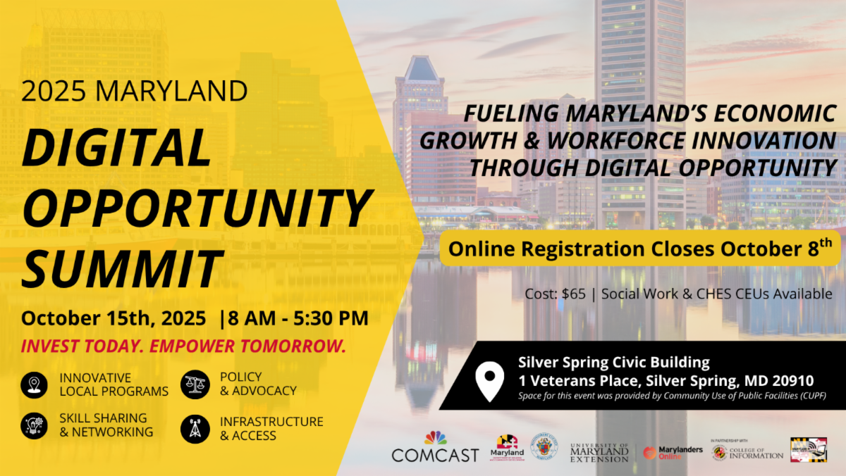 | | The 2025 Maryland Digital Opportunity Summit will convene state leaders, policymakers, and community advocates on October 15 to accelerate progress in advancing broadband, digital skills, and economic opportunities throughout the state. This year's summit carries the theme, "Investing in Maryland's Future", and is designed for workforce development professionals, broadband infrastructure specialists, community leaders, policymakers, educators, business owners, and anyone committed to advancing digital opportunities in the state of Maryland. Read the press release. | | Online registration for the 2025 Maryland Digital Opportunity Summit closes October 8, with a limited number of same-day registrations available at the event. | | Continuing Education Opportunities | | Attendees of the 2025 Maryland Digital Opportunity Summit are eligible to apply for 6 Health Education CECHs and 4 Social Work CEUs. Additional information can be found here. | |