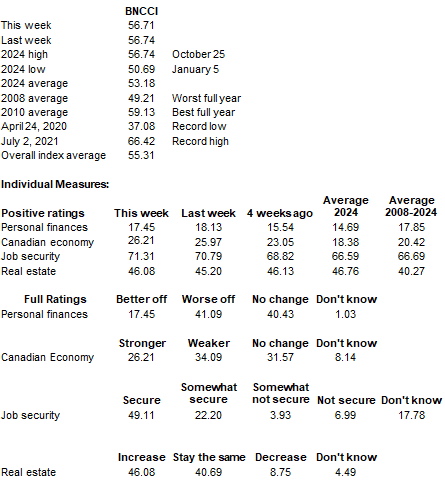 The BNCCI is produced by the Nanos Research Corporation, headquartered in Canada, which operates in Canada and the United States. The data is based on random telephone interviews with 1,000 Canadian consumers (land- and cell-lines), using a four week rolling average of 250 respondents each week, 18 years of age and over. The random sample of 1,000 respondents may be weighted using the latest census information for Canada.
