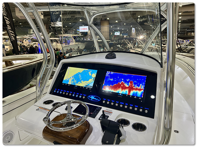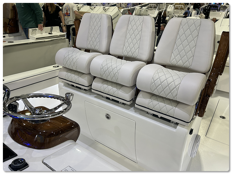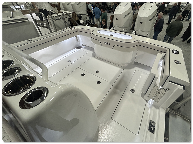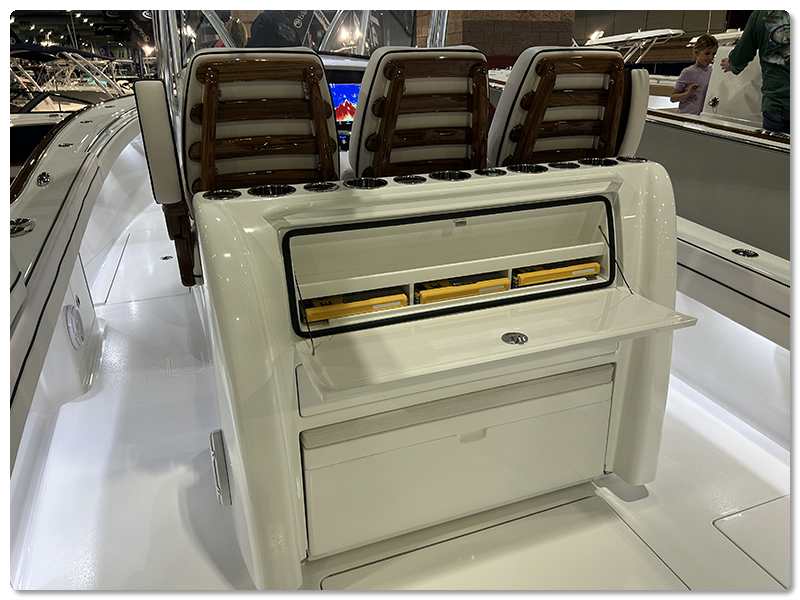 Every inch of a Valhalla is well thought out. Case in point: the helm seating module, which holds a slide-out cooler (designed and built in-house) at its base, a pull-out drawer in the center, and at the top a locker with tackle boxes and a lid that doubles as a work table when down. The entire module “floats” above the sole, providing 360-degree toekick. |