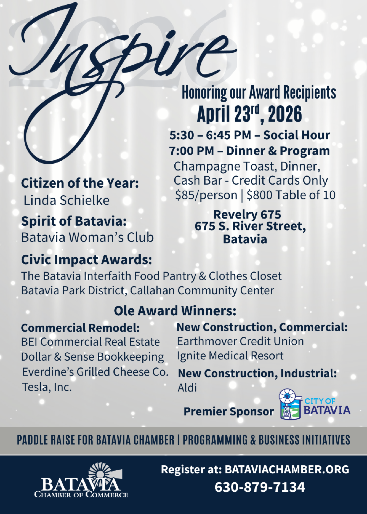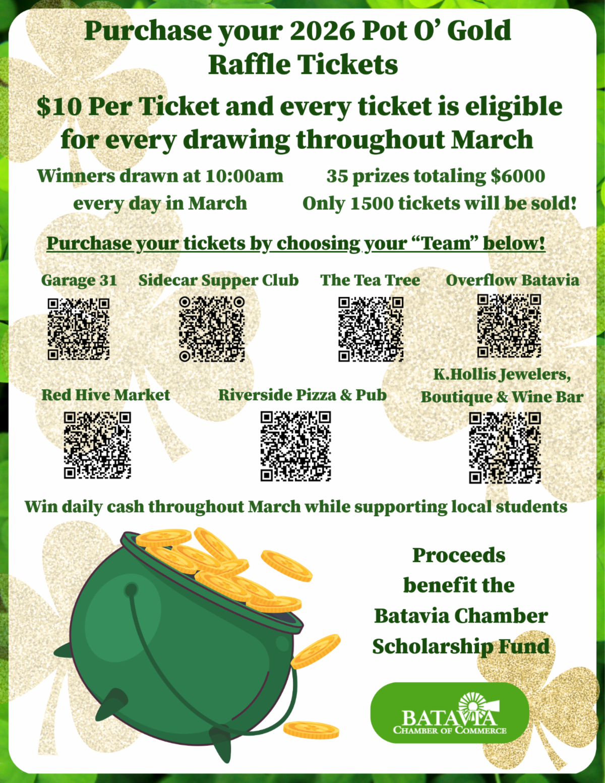 We're raising money for the Batavia Chamber Inspire Scholarship Fund and having a little fun along the way! Purchase raffle tickets for only $10 and be entered every day in March for your chance to WIN! More tickes = more chances to win!