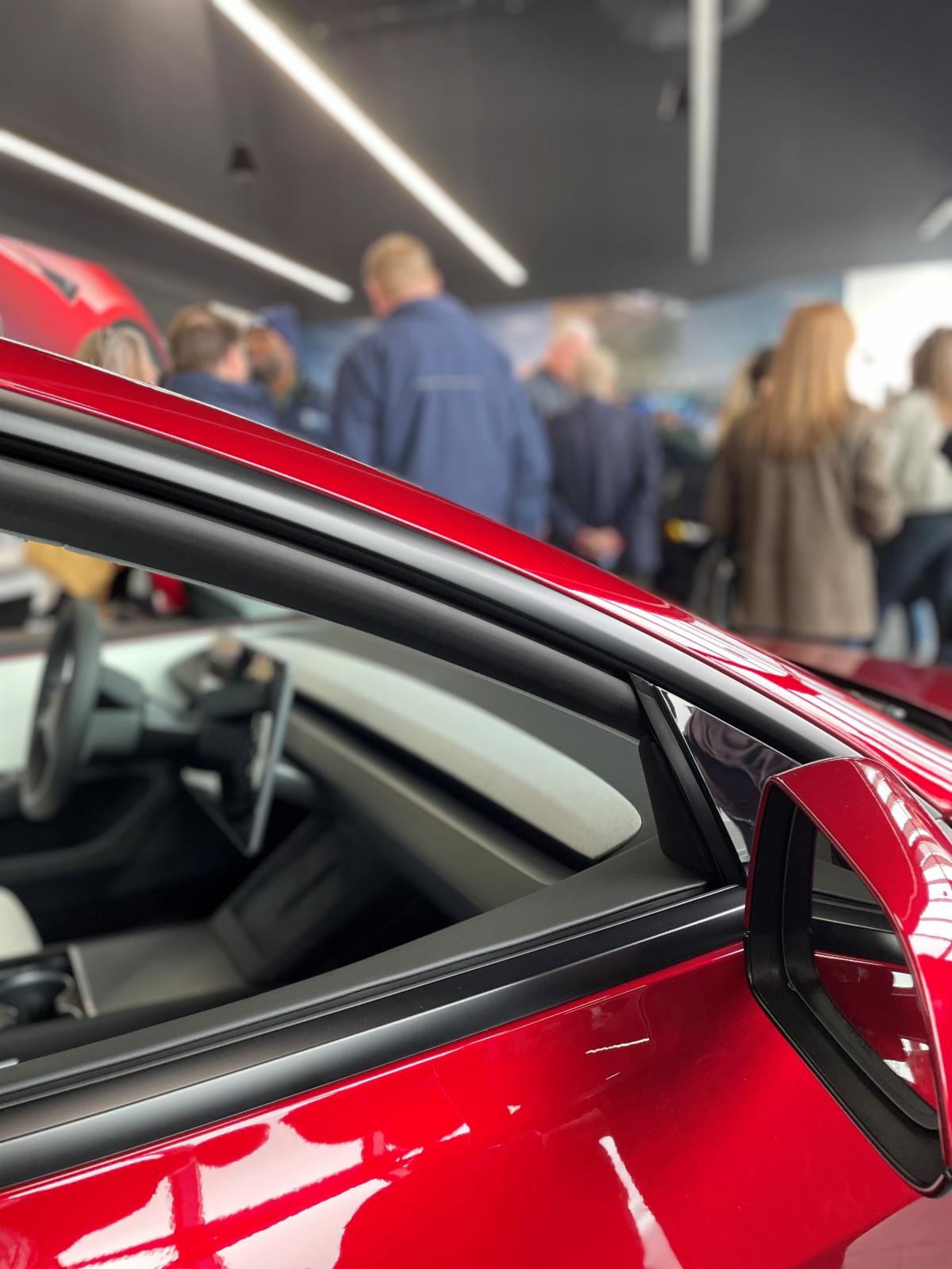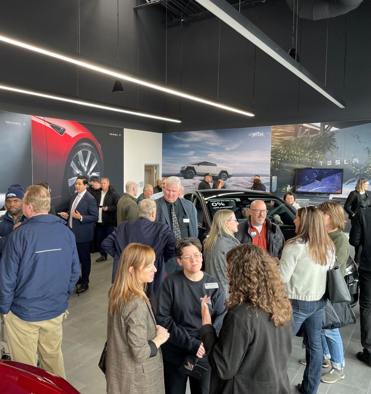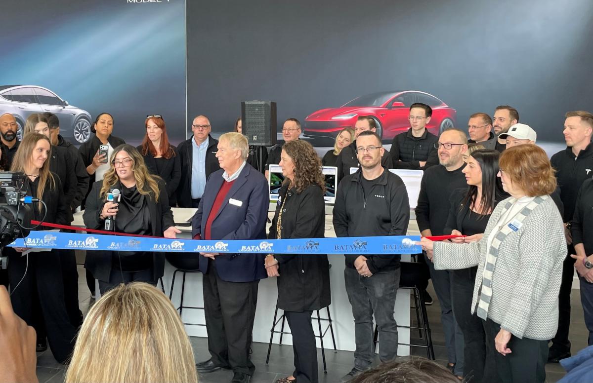Batavia Chamber President & CEO, Margaret Perreault, Mayor Schielke, Chamber Ambassadors, Tesla VIP's and employees and many members of the community all were in attendance to officially cut the ribbon and welcome Tesla to Batavia.