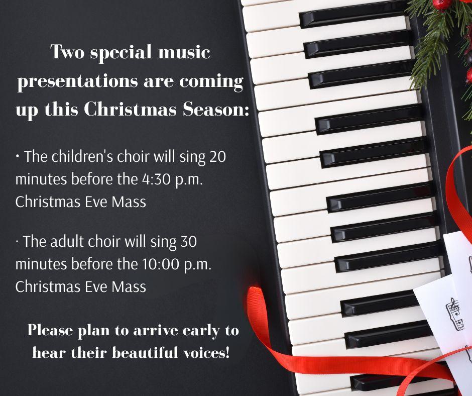 The Adult Choir will sing 30 minutes before the 10 p.m. Mass