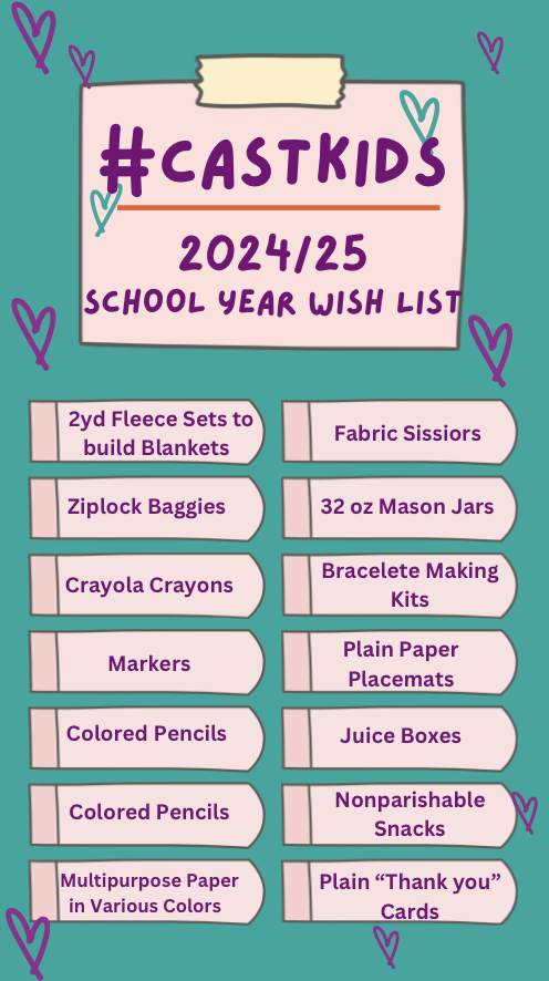 Our time spent with #CASTkids truly makes a real difference in students’ lives, schools, and our community as a whole. As you're shopping this month, please consider adding a few extra items to your cart. Our supply list is a bit different from the usual, so a trip to the craft store might be just what you need!