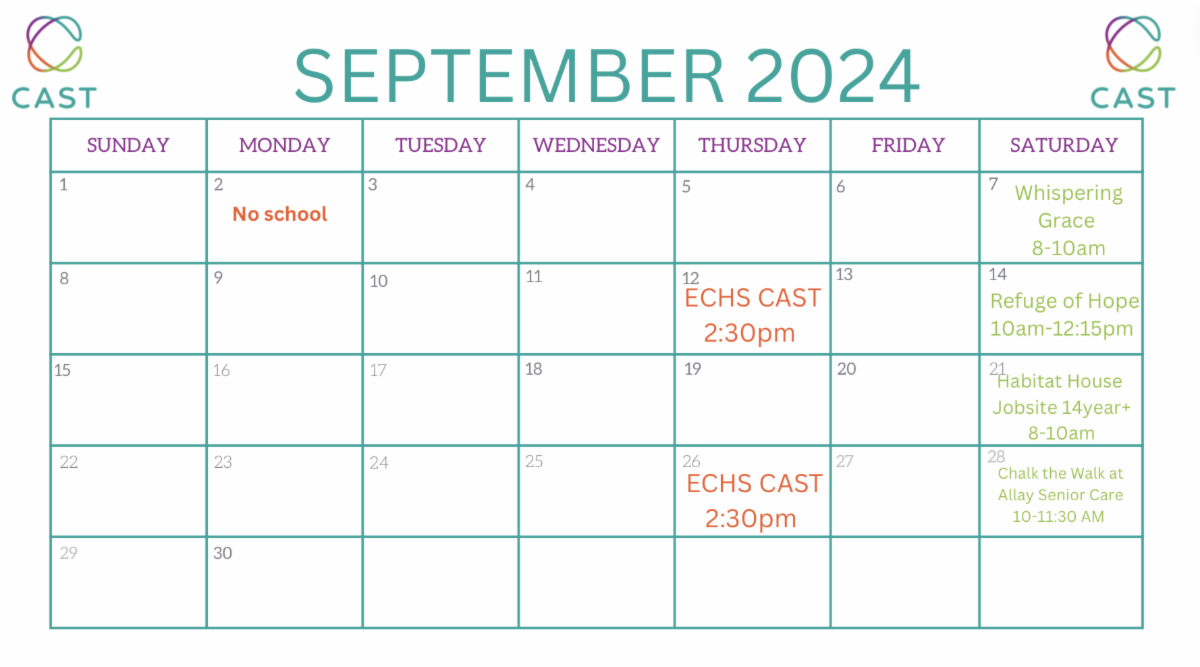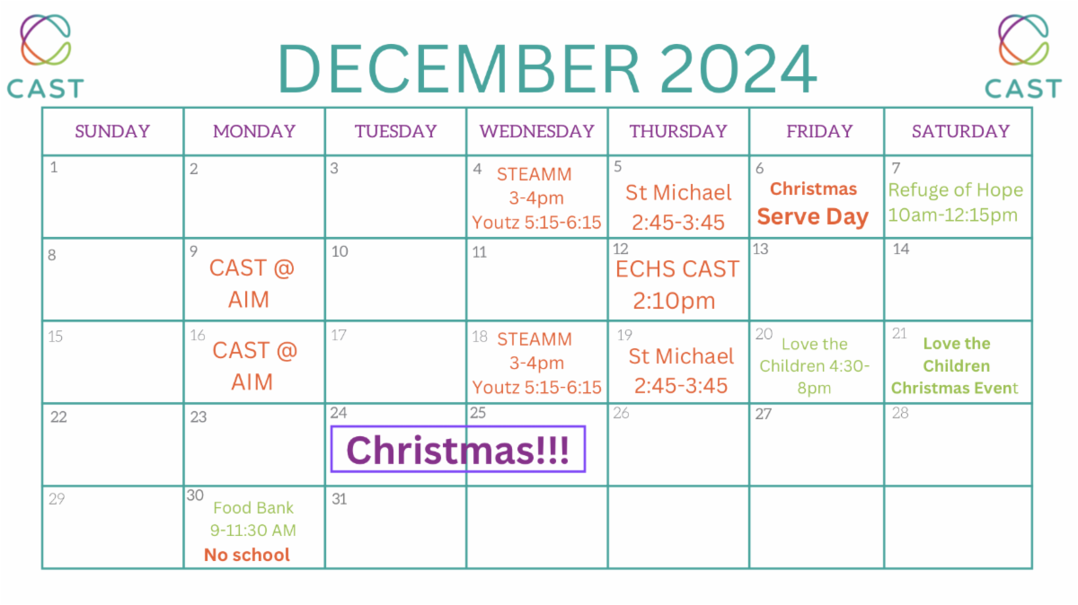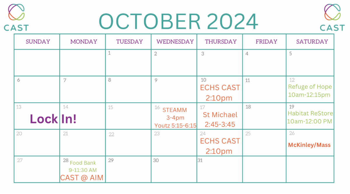 We'd love for you to join our #CASTkids as they make a hands on difference in their community. Take a look at our calendars below and choose a day that you would like to volunteer alongside the #CASTkids or help provide an afterschool snack.