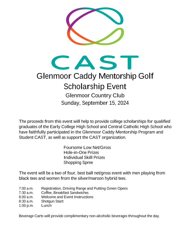Last Chance to Sign Up! Join us for the annual Glenmoor Caddy Mentorship Golf Scholarship event on Sunday,September 15th. Proceeds will support college scholarships for deserving Early College and Central Catholic High School graduates who have been dedicated to the Glenmoor Caddy Mentorship Program and Student CAST.