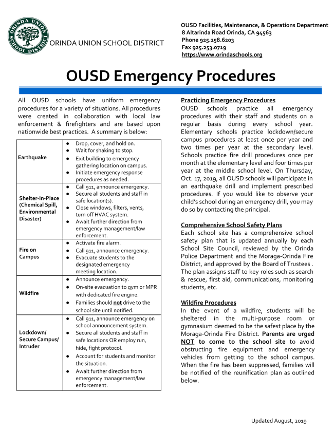 Also included in the OUSD Emergency Procedures document are ways parents can help, information about emergency supplies at our schools, and reunification plans when students have to be moved to a different location.