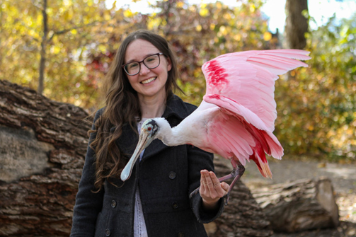 Photo caption: Anne holds a Roseate Spoonbill, a species native to where she grew up in South Texas.