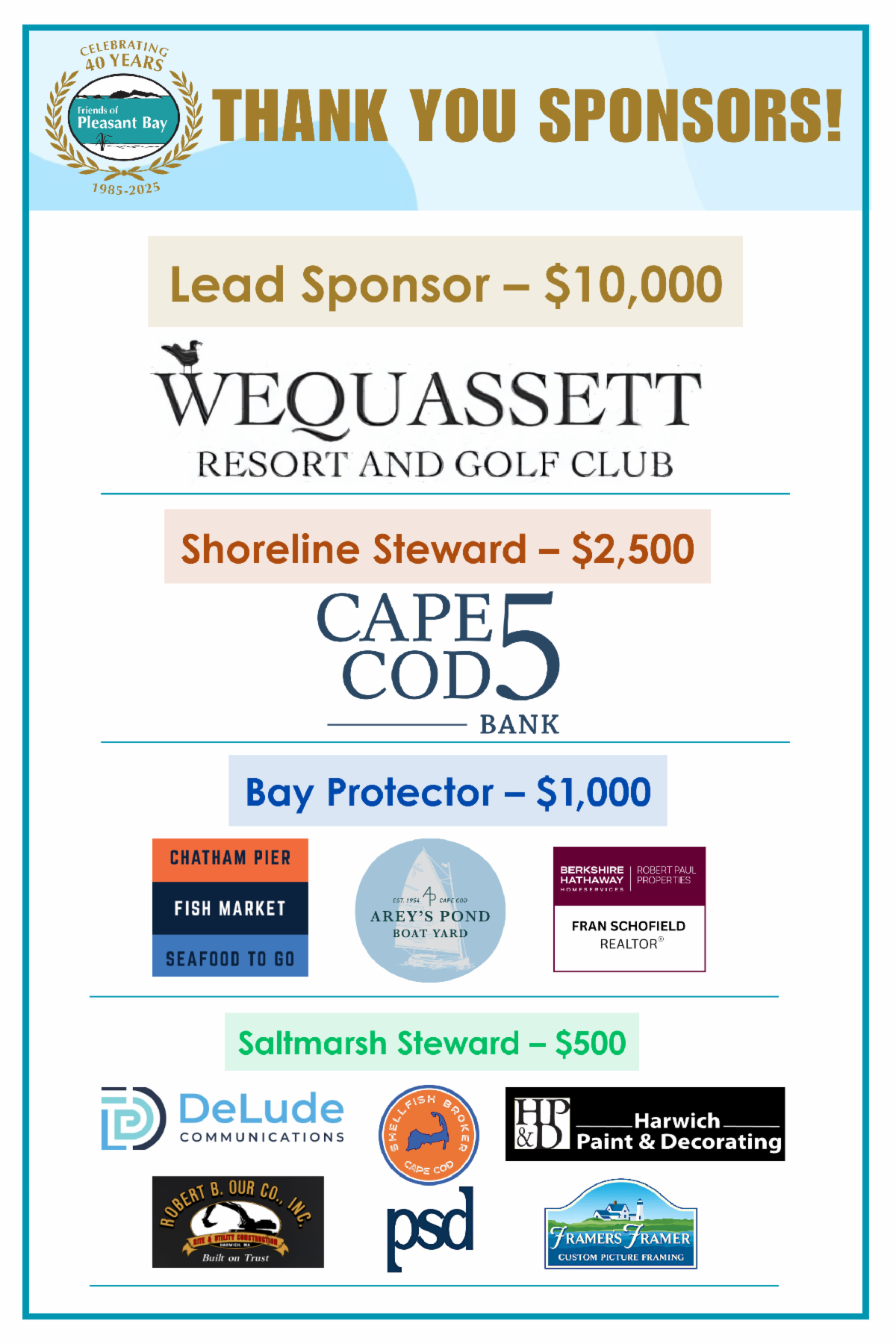 Our 40th Anniversary Celebration was a joyful milestone — made possible by our generous sponsors. Their support honors four decades of stewardship while helping us safeguard Pleasant Bay’s future. When you trade with these businesses, please thank them for supporting Friends of Pleasant Bay. Together, we’re making a lasting difference!