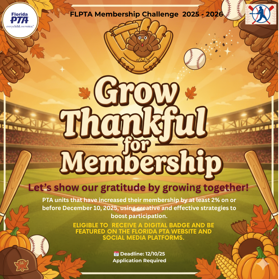 This award is given to PTA units that have stepped up to the plate and grown their membership by at least 2% on or before the deadline using a winning strategy to increase participation. PTA units will receive a digital badge and be recognized on the Florida PTA website and social media platforms. Due Date: 12/10/25.