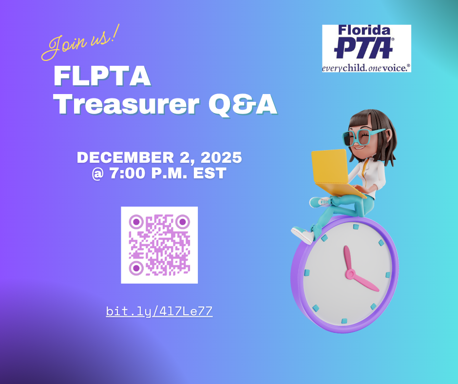 Please join FLPTA Treasurer, Erica Hamblen, online with your questions and reach out to other local unit Treasurers and officers. These sessions are open to all our PTA officers, with a focus on PTA finances. They are very informal, with not a slide deck in sight!