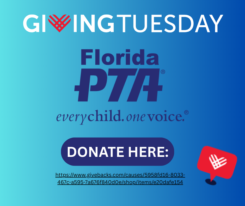 Today is Giving Tuesday, a day dedicated to generosity, community, and supporting the missions that make a difference. If Florida PTA has had an impact on you, your school, or your community, I invite you to consider making a Giving Tuesday donation today. Every contribution—big or small—helps us expand vital programs, strengthen our advocacy work, provide resources to local units, and uplift families from Pensacola to Key West. Thank you for standing with us and helping make every child’s potential a reality.