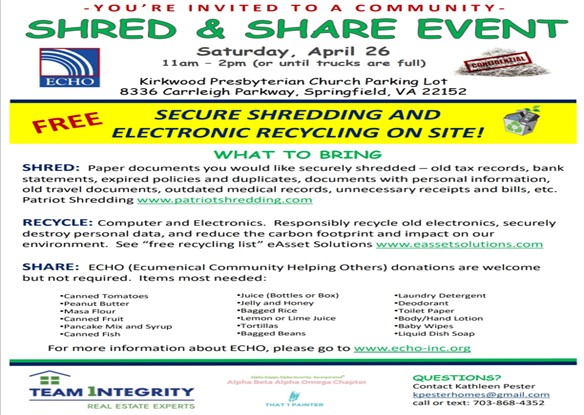 The ECHO Community Shred and Share Event offers secure paper shredding plus electronics recycling and asks only that you bring a donation of non-perishable canned or boxed foods or personal hygiene items for ECHO’s Food Pantry. The event starts at 11:00 am and goes until 2:00 pm, or until the trucks are full, at Kirkwood Presbyterian Church, 8336 Carrleigh Parkway, Springfield.