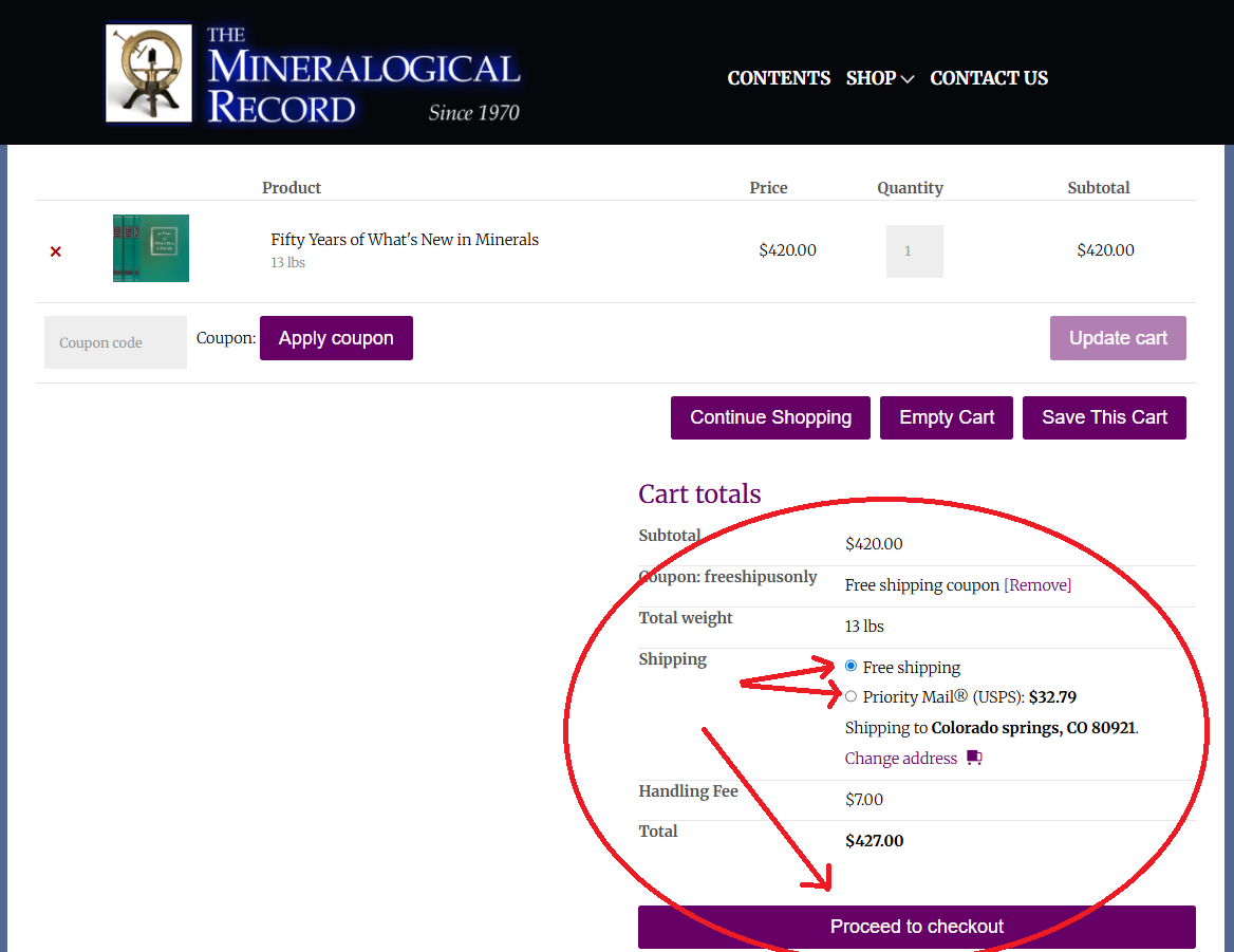 4) Click inside the "Free shipping" circle, moving the blue dot from "Priority Mail". Wait for cart to update. Click on "Proceed to Checkout"