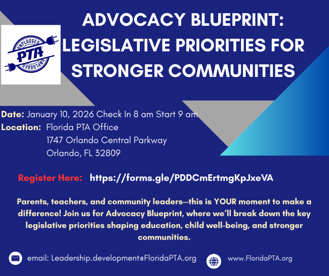 Florida PTA Family, I hope you had a joyful holiday season and a wonderful start to the New Year. As we step into 2026, I want to thank each of you for your continued dedication to children, families, and school communities across Florida. Your commitment and advocacy are what make our work possible.