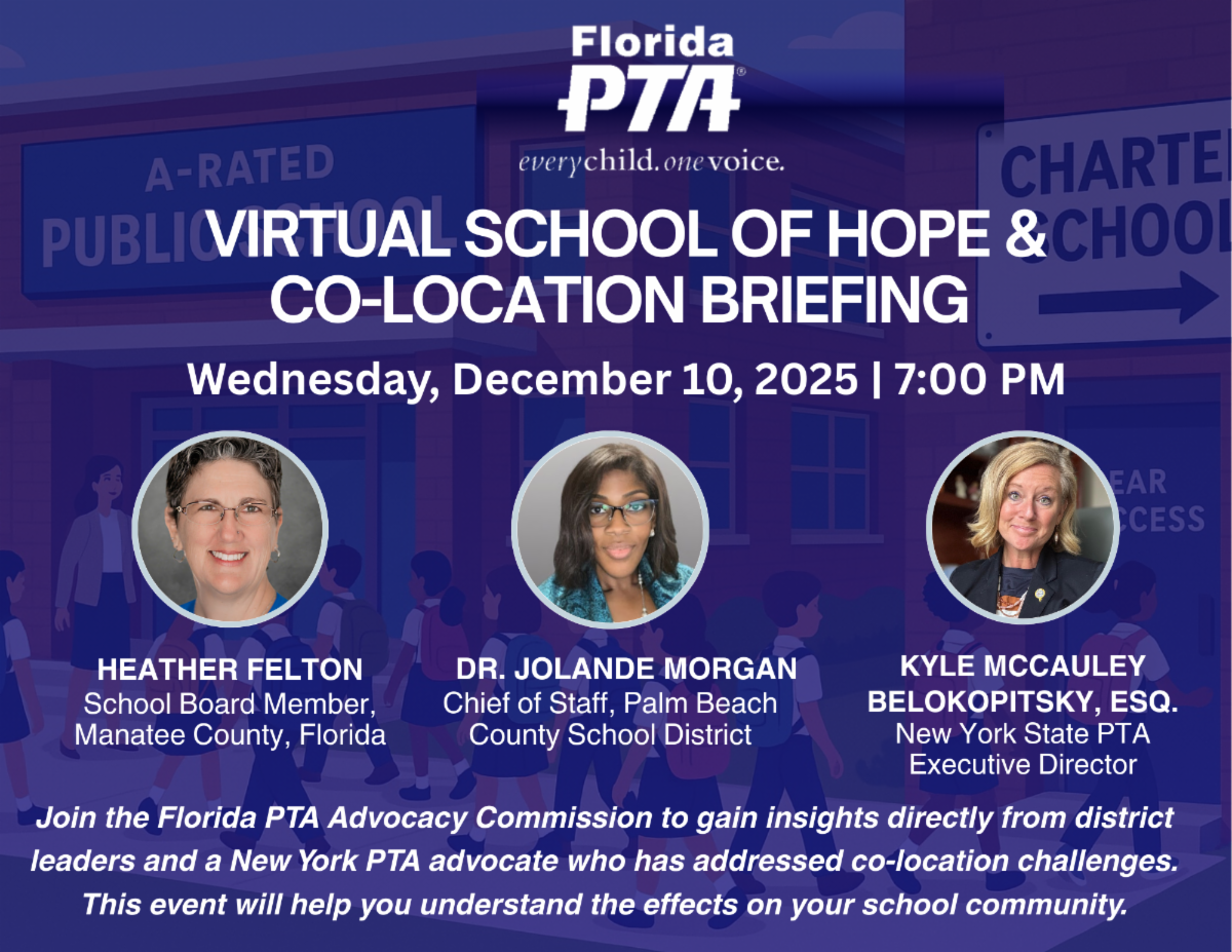Last month, Florida PTA hosted a Virtual School of Hope / Co-Location Briefing. One takeaway was clear: when state policies shift, the effects show up quickly in school buildings, staffing, student services, and district budgets. Co-location is one example—but it is not happening in isolation.