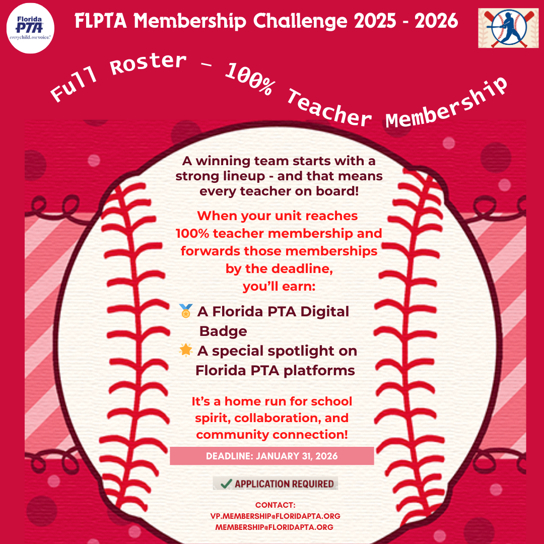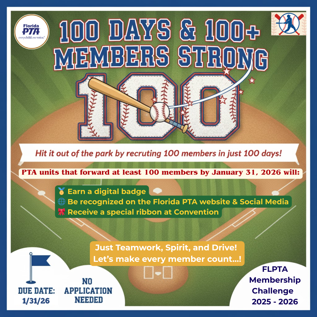 Hit it out of the park by recruiting 100 members in just 100 days! All PTA units that forward* at least 100 members on or before the 100th day of the 2025-2026 A term will earn a digital badge, be recognized on the Florida PTA website and social media platforms, and receive a ribbon at the annual Convention.