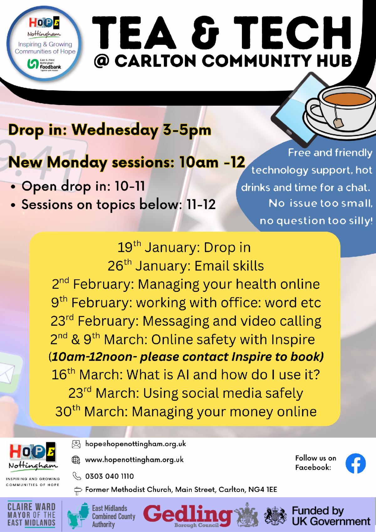 Hope Nottingham began our Wednesday afternoon "Tea & Tech" sessions at our Carlton Hub before Christmas with the aim of providing a friendly, welcoming place for people to get help and support with using devices, getting online and accessing internet-based services. We have now expanded this provision to include some additional Monday morning sessions, which as well as a general drop-in, include sessions looking at specific common themes - everything from using email to staying safe online. The sessions are open to all - whatever your 'tech' experience - no question is too silly to ask!