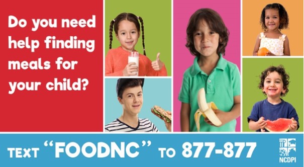 Do you need help finding meals for your child? Text FOODNC to 877-877. After you enter your address, you will get a text back with the location and serving times of nearby sites offering free meals for children ages 18 and younger. Sites are set up across NC. #COVID19NC