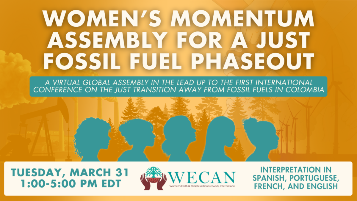 In support of this vital gathering, on March 31, 2026, WECAN is hosting global women leaders at a virtual pre-conference assembly to strategize and generate momentum for action on a fossil fuel phaseout and a Just Transition. During the “Women’s Momentum Assembly for a Just Fossil Fuel Phaseout,” policymakers, frontline leaders, global advocates, and parliamentarians will discuss the challenges to ending the era of fossil fuels as well as successful policies, campaigns, and solutions to ensure a just and equitable phaseout.