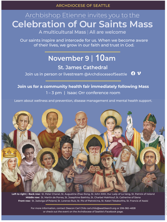 SUNDAY, NOVEMBER 10 CHILDREN’S FAITH FORMATION CLASSES AND PARENT GATHERING at 11am, O’Dea High School. The parent gathering takes place in Room 202 of O’Dea while the children are in class. Guest speakers, Corinna Laughlin and Maria Laughlin, will present on their recently published graphic novel, I Can Do All Things in Him Who Strengthens Me – The Story of St. Francis Xavier Cabrini. Come enjoy coffee, tea, snacks, and fellowship!