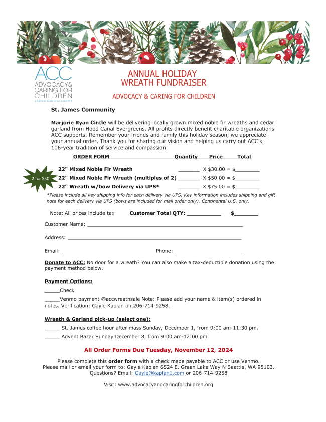 CHILDREN’S FAITH FORMATION WEEKLY EMAILS are sent out to registered families in the program each Thursday with the subject heading, “CFF Thursday Tidings.” If after you check your junk e-mail folder, you are not receiving these informative weekly e-mails, contact Tami Kowal, tkowal@stjames-cathedral.org or 206-219-5822.