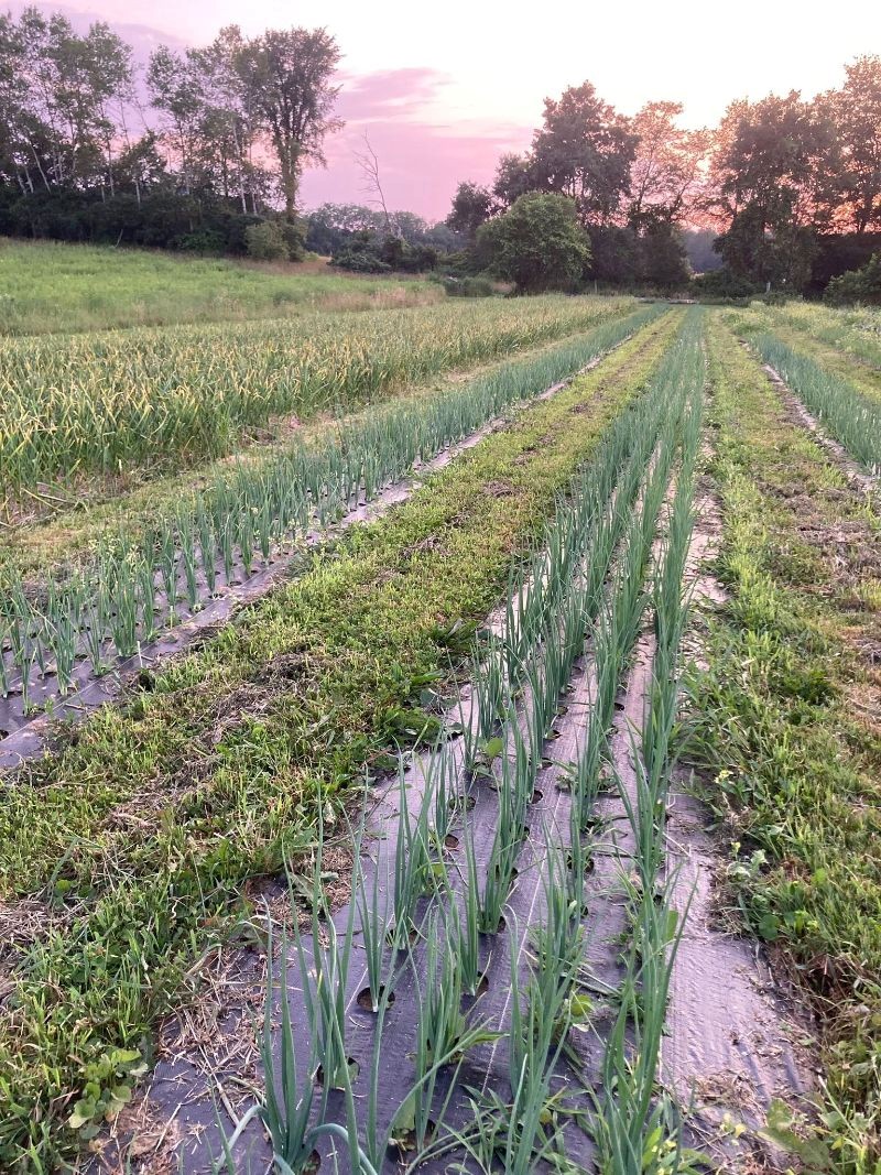 | Steph also said fabrics have been an excellent investment. Shade cloth has reduced the heat in two of the high tunnels, allowing them to produce lettuce mix and spinach into mid-July. They started using a specialized insect netting over any crops sensitive to cabbage worms or flea beetles, decreasing the stress on those plants when they are young. While they have used row cover before, this new design of hoops and netting allows the farm staff to easily lift the covering to harvest the crop and then slide down the cover again. Pictured is the onion crop thriving in the ground cover, which is permeable, allowing moisture to enter and then conserving it. Funding came from the iCAP Core award from the WNY Foundation. | |