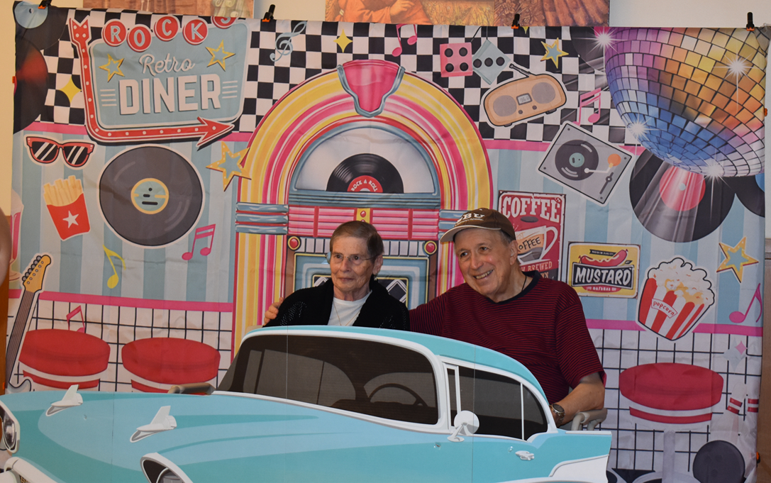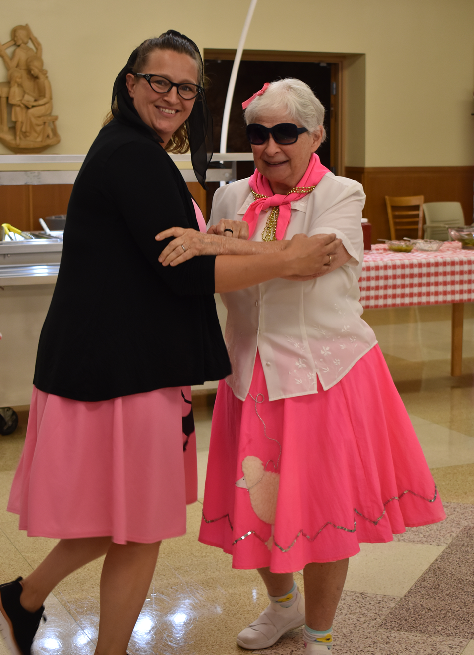 The Activities and Dietary departments hosted a sock hop last week in St. Elizabeth Motherhouse, and everyone had a blast. Along with 50s music and decorations it included a menu of burgers & fries, hot dogs, onion rings and root beer floats. Sr. Sharon and Fr. Dominic went cruisin’ to the photo booth while Sr. Barbara and Catrina from Activities, dressed in poodle skirts, took to the dance floor. | | | | |