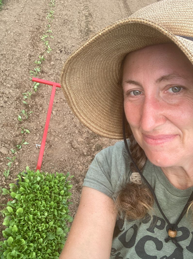 She says they’ve been reflecting on the tools and infrastructure that are saving the workers and volunteers a huge amount of labor. One of the tools is the Paperpot transplanter (pictured behind her). She said it’s been a game changer already and they are still learning how to use it to its full potential. She explained that the Paperpot transplanter allows one person to do a project in minutes that would otherwise take a few hours.