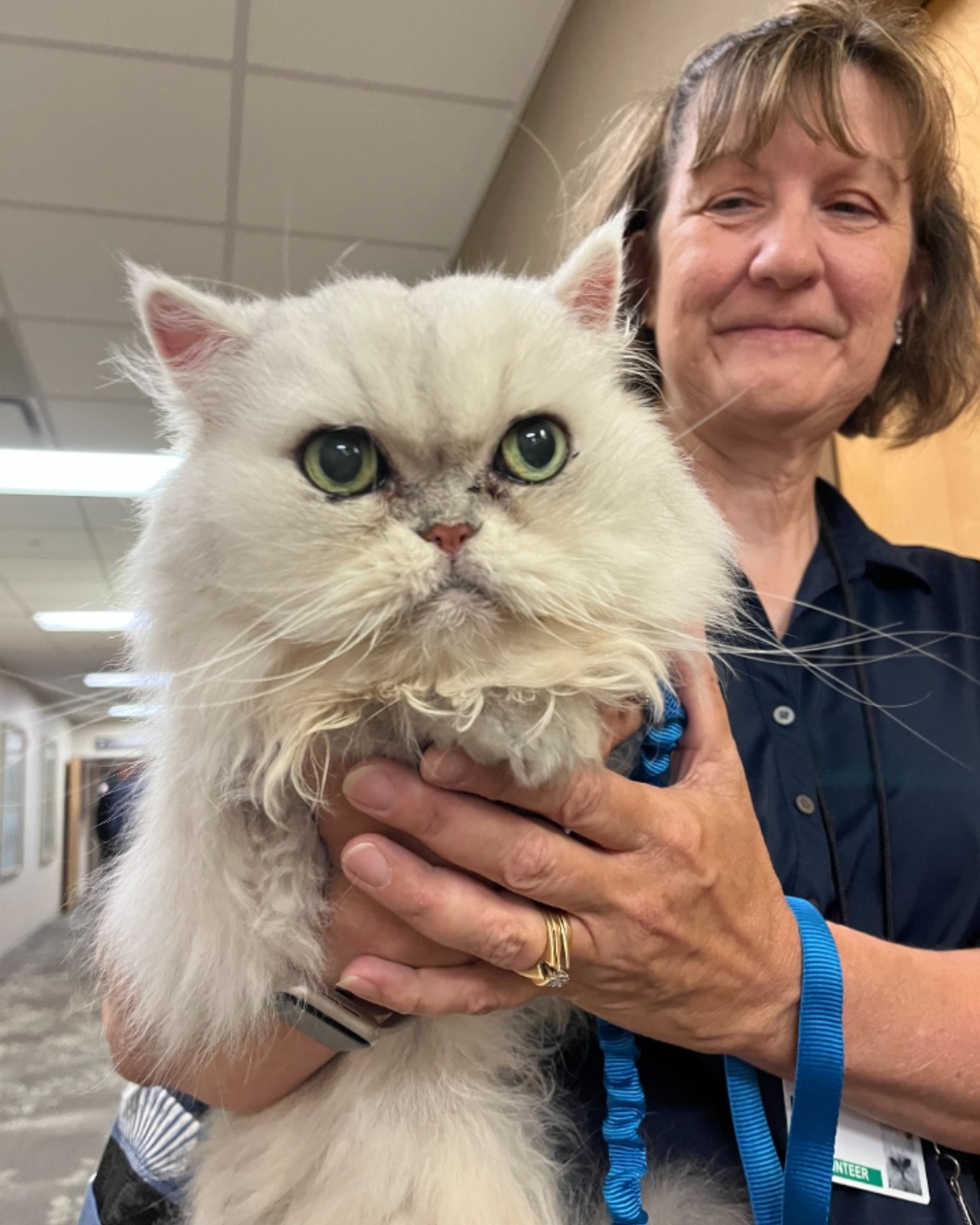 Kathy, Bentley’s handler and owner, is also a pet therapy volunteer at the hospital. She says, “Bentley has a calm, inquisitive disposition and he loves people. He’s just a ‘chill cat’ and that makes him a very good therapy pet.”