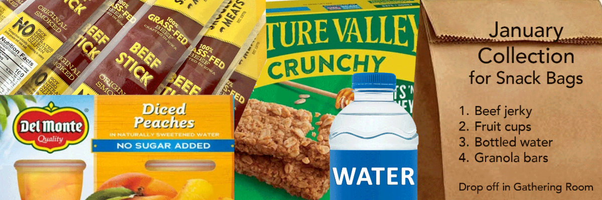 | | Telling our Outreach Stories | | Thank you to everyone who donated snack bag items in January. We collected enough items to fill 1,000 snack bags! These bags will be distributed to visitors coming to our church seeking assistance. A snack bag is a small gesture that allows us to share tangible help and hope while guiding them to resources provided by our Community Partners. | |