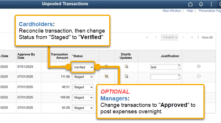 Cardholders/Proxies will now need to mark reconciled transactions as "Verified" instead of "Approved". Verified transactions remain visible to the cardholder and will automatically post on the listed "Approve By Date," unless a manager manually marks them as "Approved." |