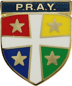 The Four Star pin features four gold stars on a red, yellow, blue, and green background. The four colors represent the four levels in the P.R.A.Y. Series, but the stars are reminiscent of Matthew 5:16: Let your light shine before others, that they may see your good deeds and glorify your Father in heaven. Four star recipients are challenged to their lives in such a way that others will see Christ in them and give God the glory.