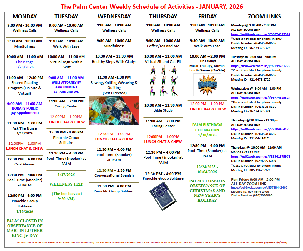 Our programs continue to grow, and the energy across PALM is truly exciting. From Walk With Ease on Fridays (and select Wednesdays), to the Caring Center, created to support your mental and emotional well-being, there is always something happening. Add in pool tournaments, friendly competition, laughter, and community pride, and you truly haven’t seen anything yet. More activities more fun, and more joy are on the way.