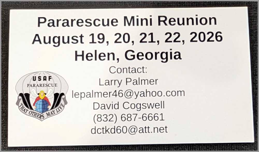 Attending the reunion is free, that's right, free. Your only expense is your lodging and meals. You can start making hotel reservations today. Call 706.878.2271 and mention you are attending the Pararescue Reunion when you make your reservation. If you want more specific information, contact Larry Palmer or David Cogswell. There info is in the card above.