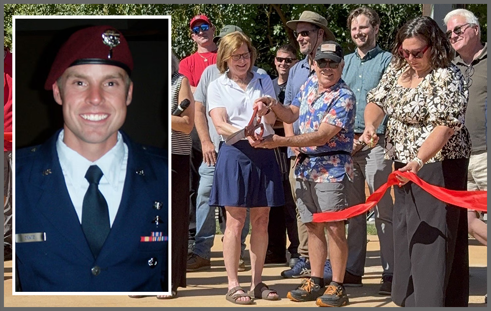 Steve and Judy Gentz cutting a ribbon honoring their son Captain Joel Gentz, who was killed in action while serving as a pararescue officer in Afghanistan in 2010, at a dedication ceremony for a new trailhead to the Border to Border Trail at Timber Town Park in Chelsea, Tuesday, September 30, 2025. | | |