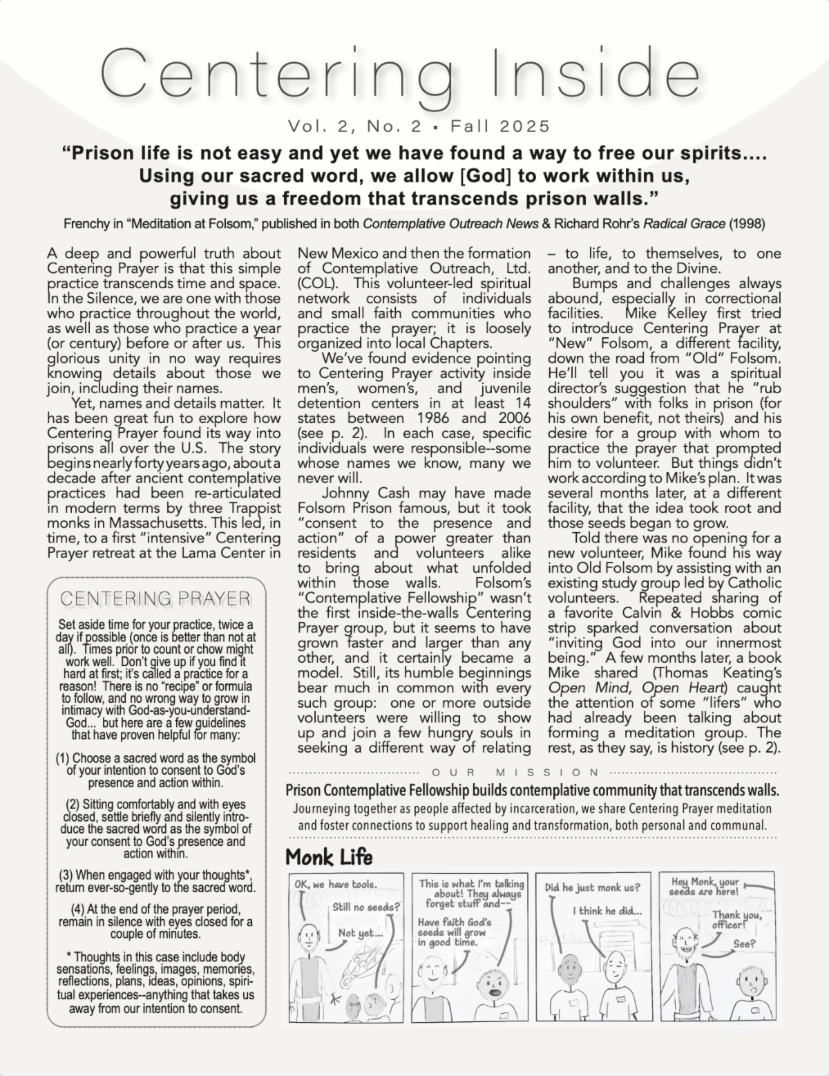 Buoyed by this practice rooted in Christian monasticism but accessible to people of all faiths and no particular faith, we can experience the reality that God (hear Love, Life, Source, Universe, or whatever works best for you), in Tom Neal's words, "has descended inside our broken minds that race, our bodies that ache, our relationships that wound, our histories that burden" and "enters to heal them from within, by embracing them all as his (sic) own." Tom is here describing what he calls, "the consolation of Christmas," but is this not simply an elaboration of one of Lawrence's frequent reminders to the Outside the Walls group: "God's got you!"?