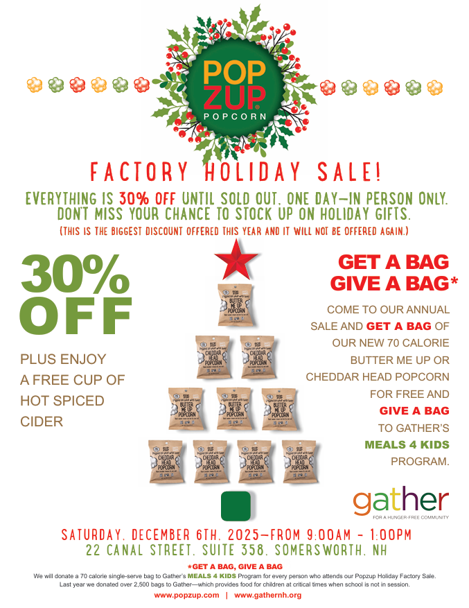 Popzup Popcorn is opening their doors to all local customers in time to stock up and save money on holiday gifting. This is a one-day, in-person only—30% off all popcorn, seasoning and Movie Time Popcorn Kits shopping event. In addition, each person who stops by gets a single serve bag of popcorn and gets to add another bag of popcorn to their "GET A BAG, GIVE A BAG" donation box, as part of our ongoing commitment to support Gather's Meals 4 Kids Program.